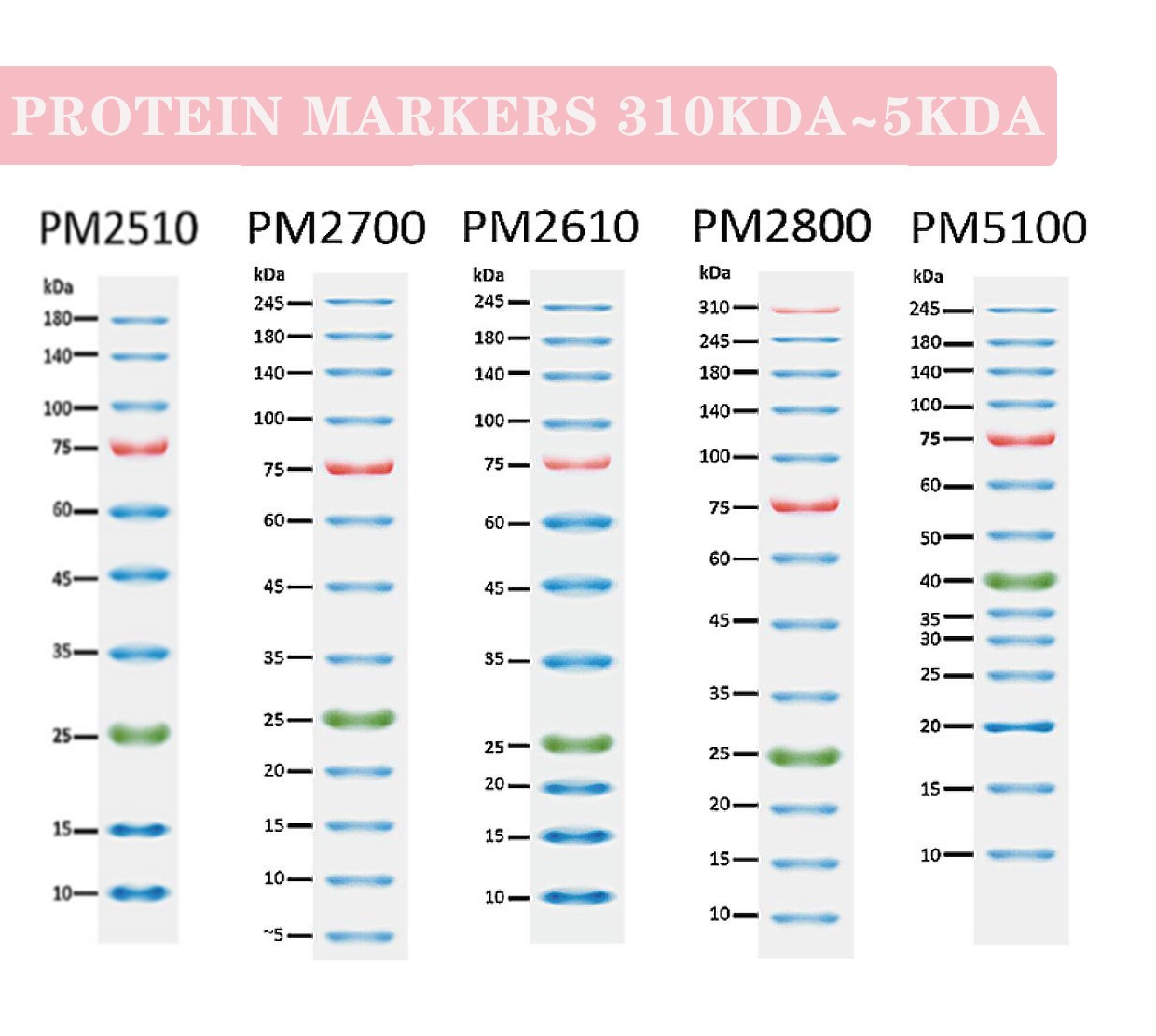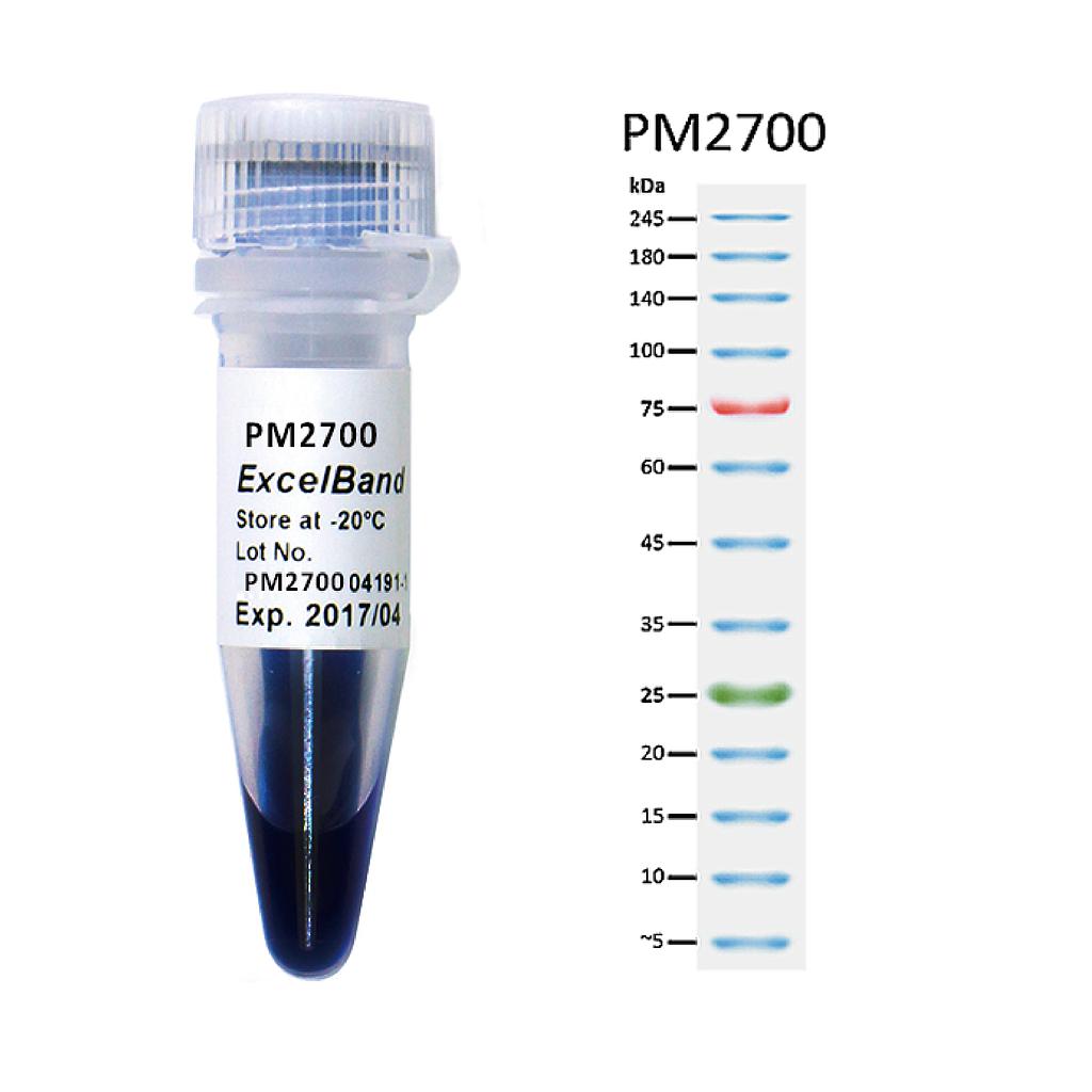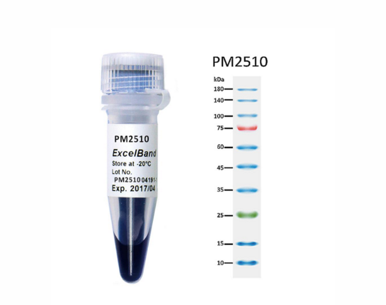 內(nèi)含有 10條彩色預(yù)染蛋白條帶:10,15,25,35,45,60,75,100,140,180KDa,兩個(gè)參考條帶 — 75 kDa(紅色)、25kDa(綠色)可快速辨別片段大小,即用型